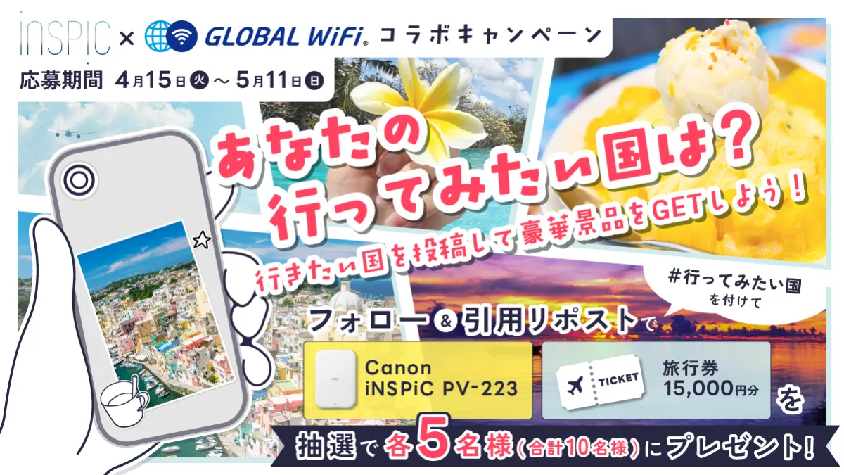 キャンペーンは「グローバルWiFi®×iNSPiC#行ってみたい国投稿キャンペーン」と銘打たれ、2025年4月15日から5月11日までの期間中に行われます。参加者は指定された条件に従って、希望する国名を投稿するだけで応募が可能です。具体的には、ビジョンが運営する「グローバルWiFi®」公式アカウント[@GLOBAL_WiFi]と、キヤノンMJの起業部門である「ichikara Lab」の公式アカウント[@ichikaraLab]をそれぞれフォローし、「#行ってみたい国」を付けて国名を投稿すると、エントリーが完了します。