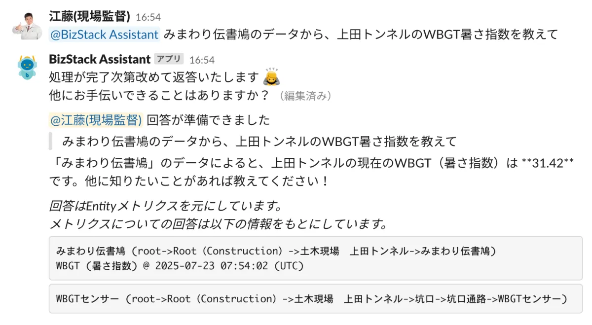 BizStackが、みまわり伝書鳩からリアルタイムの天候データを理解し、チャット形式で状況を瞬時に報告できる機能は、現場での作業に重要な役割を果たします。例えば、作業員が「いまの風速は?」や「暑さ指数は?」と尋ねると、AIアシスタントは即座に応答し、作業の中断判断や注意喚起を行います。