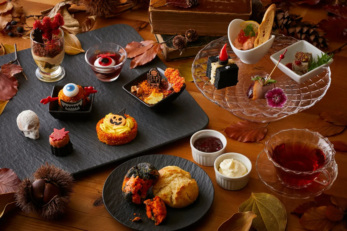 大阪のスイスホテル南海大阪では、紅葉の季節を反映したアフタヌーンティー「モンスターズオータムパーティ」が用意されています。キャラメルクリームと洋梨のトライフル、ほくほくのかぼちゃプリン、ドクロ型のマドレーヌなど、ユニークでおいしいスイーツが楽しめます。さらに、鴨とサツマイモのブロシェット、栗と柿のミートパテを使用したセイヴォリーも季節感たっぷりのメニューです。
