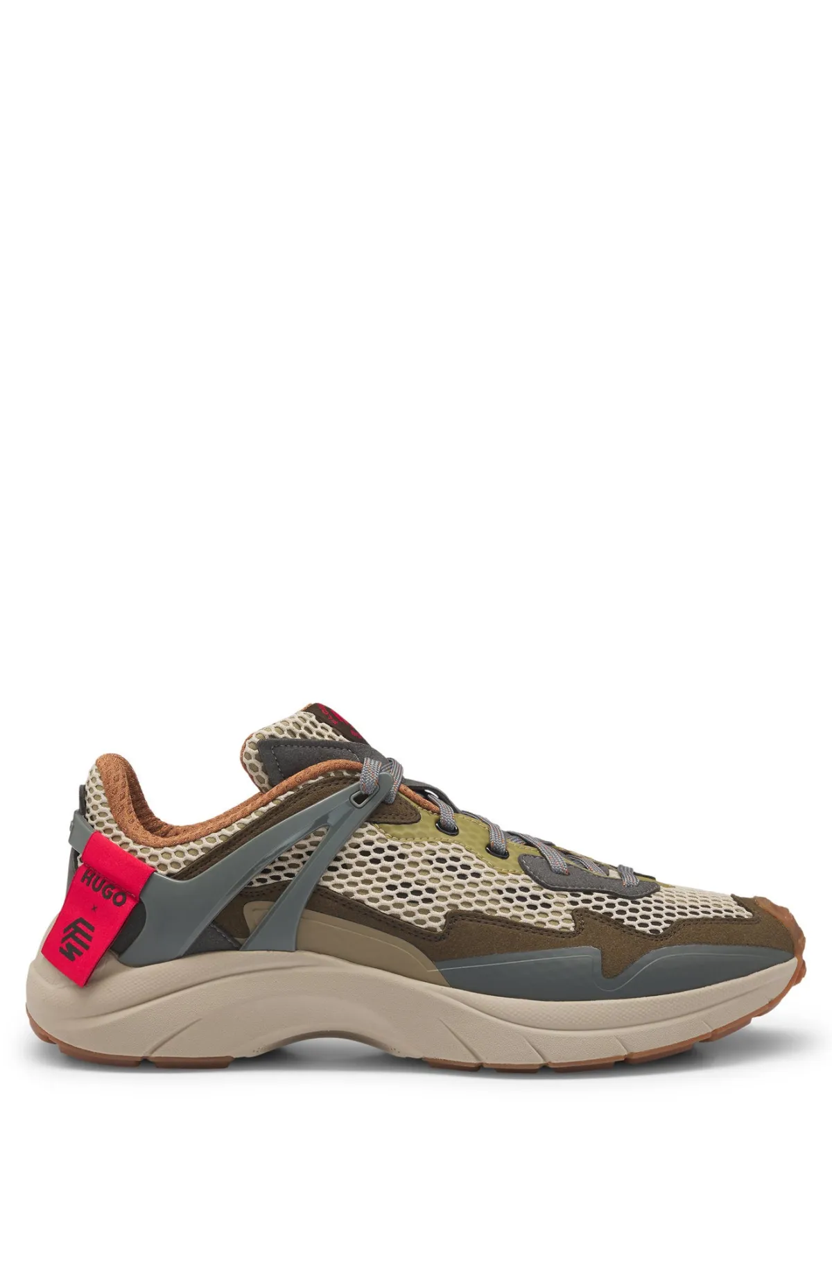 オープンメッシュパネルと重なり合うレイヤーで構成されたデザインは、ベージュを基調にグレー、グリーン、ブラウンといったアースカラーを採用し、脱構築の美学が感じられます。洗練されたランニングスタイルをベースにしながらも、ハイキングを意識したトレッドソールやHUGOの赤いラベルの大胆な再解釈など、破壊的なアクセントが施されています。