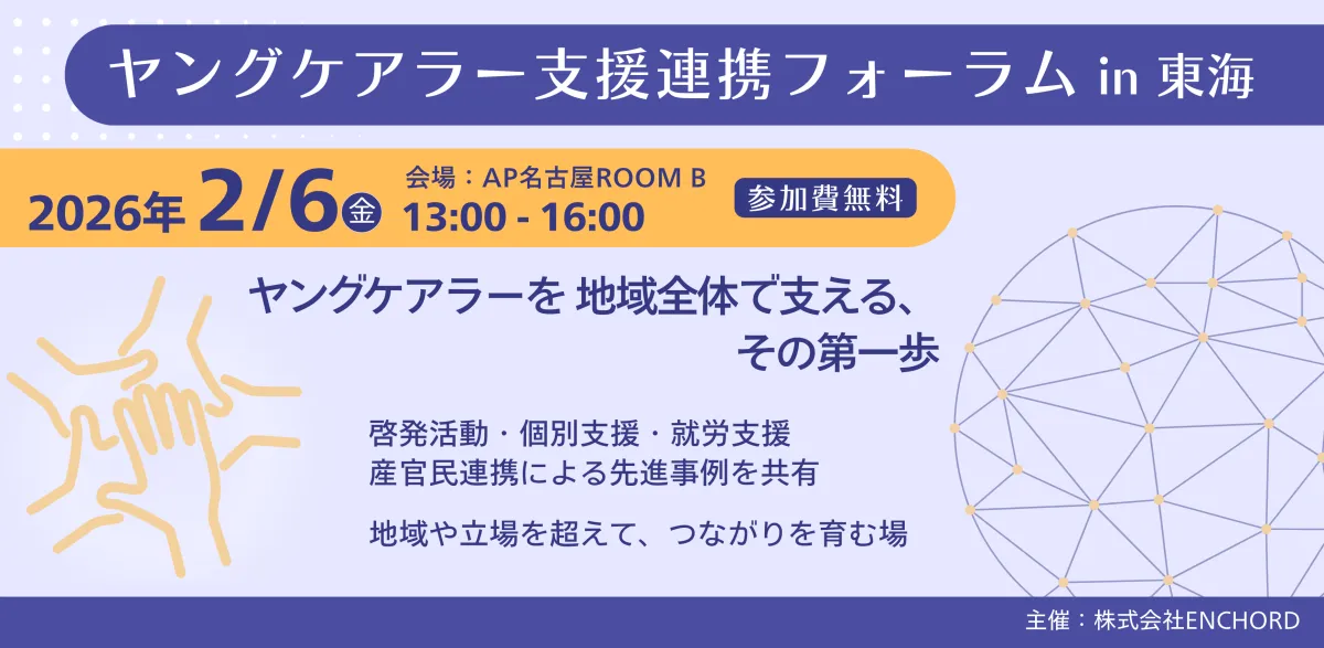 若者世代が抱える家族の世話と就労の両立を取り上げる「ヤングケアラー支援連携フォーラム」が、2026年2月6日(金)に名古屋市で開催されます。主催は株式会社ENCHORDで、産官民の協働による先進事例の共有を目的としており、現場の課題解決に向けた第一歩と位置づけられています。