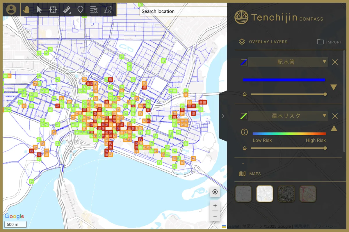 従来のメッシュ単位での漏水リスク診断では、広範囲でのリスクを俯瞰的に分析することができましたが、今なら属性情報との組み合わせにより、さらに具体的な状況を把握することが可能です。これにより、より効率的な水道維持管理が実現することでしょう。