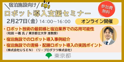 2024年2月27日、東京都で宿泊施設向けの支援セミナーがオンラインで開催されます。このセミナーでは、宿泊業界におけるロボット導入事例や、その成功のためのポイントについて深堀りし、参加者が抱える不安を解消することを目的としています。