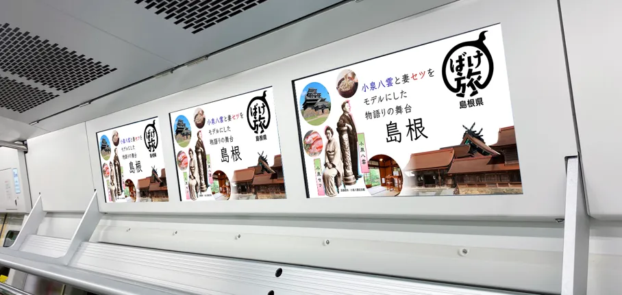この「しまね“ばけ旅”キャンペーン」は、2023年4月20日から5月3日までの期間、山手線と横須賀・総武線快速の中に設置された、デジタルサイネージ広告「traintv Adsまど上ビジョン」で放映されます。このビジョンは、網棚の上に設置された21.5インチのモニターが3面連結されており、視覚的に訴える力を持って広告を表示することが可能です。