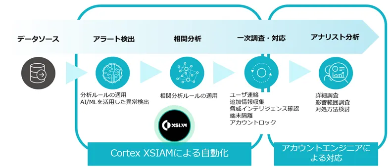 「Cortex XSIAM構築・監視サービス」は、ログ分析の自動化を通じてアナリストの負担を軽減します。具体的には、SOAR(Security Orchestration, Automation and Response)機能を活用し、アラートに対する応急対応や情報収集を自動化。これにより、アナリストはより重要な分析業務に集中することが可能になります。