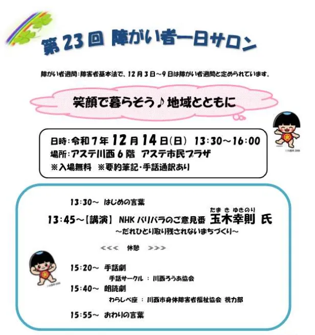 イベントは、令和7年12月14日(日曜日)の午後1時30分から4時まで、アステ川西の6階アステ市民プラザで行われます。入場は無料で、要約筆記や手話通訳も用意されているため、誰でも参加しやすい設定がされています。これは、障がいのある方々が自分を表現できる場であり、社会の一員としての連帯感を深める良い機会です。