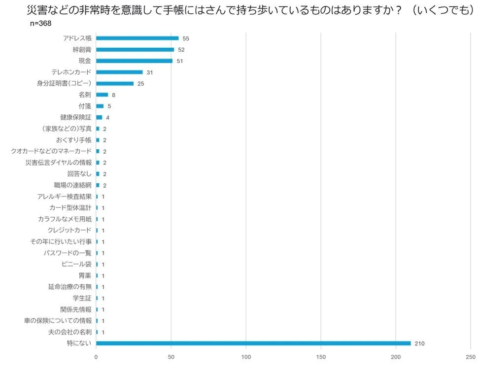 続いて「手帳にはさむもの」についての調査結果も面白いものでした。最も多く書かれているのは「アドレス帳」であり、次いで「絆創膏」や「現金」が上位にランクインしました。また、テレホンカードや身分証明書(コピー)を持ち歩くことも、緊急時に役立つと関心が寄せられています。このように、手帳は情報の記載だけでなく、非常時の準備物の管理にも利用されていることがわかりました。