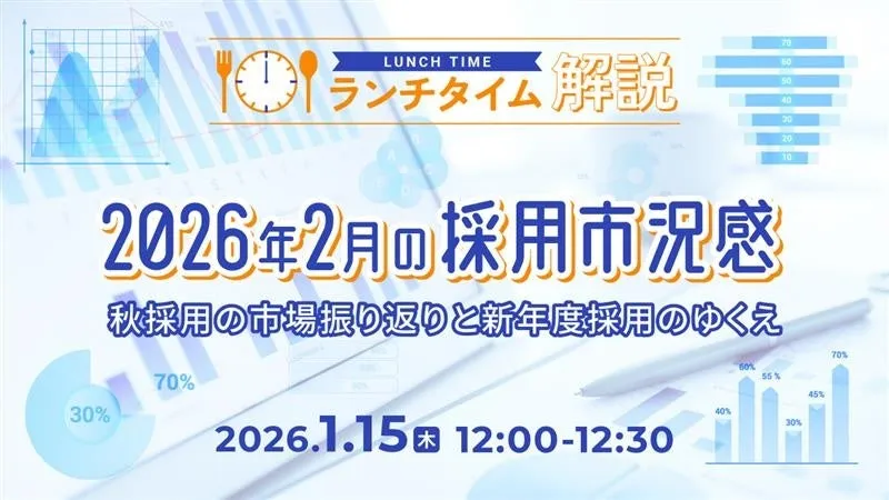 株式会社天職市場が主催するオンラインセミナー「ランチタイム解説2026年2月の採用市況感」が2026年1月15日(木)の12時から開催されます。このセミナーでは、採用市場の最新トレンドや求職者の動向について詳しく解説されます。参加は無料で、採用業務に関わる方々にとって大変貴重な情報が得られる機会です。