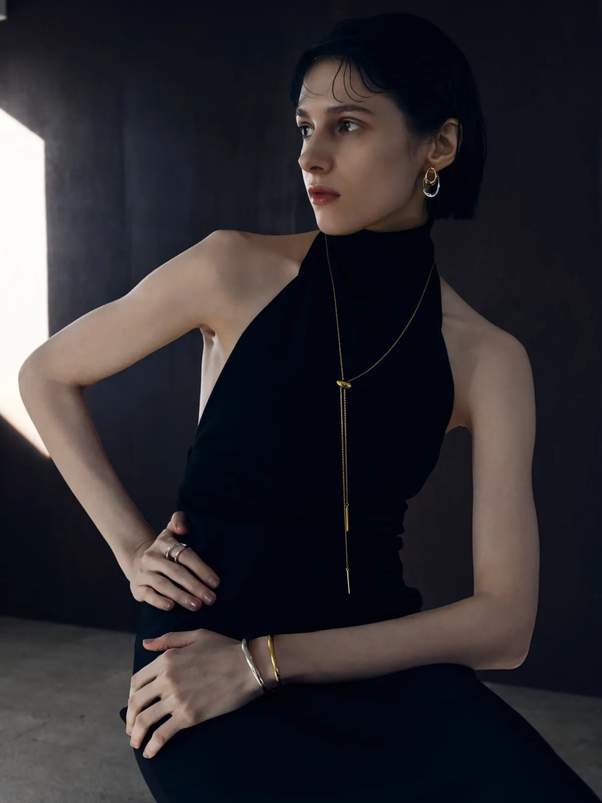 まずはネックレス。留め具とチャーム部分にスライドパーツを採用し、最長約85cmのロングスタイルで着用が可能です。この機能により、下がり部分の長さを自由に調整することで、自分らしいスタイルを演出できます。特に、身体のラインを美しく見せる形状は、柔らかさとエレガンスを兼ね備えています。