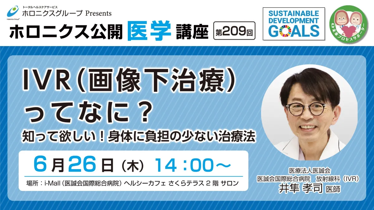 この革新的な治療法についての理解を深めてもらうため、医療法人医誠会は「IVR(画像下治療)ってなに?~知ってほしい!身体に負担の少ない治療法~」というタイトルの公開医学講座を2025年6月26日に開催します。場所は、大阪府大阪市にあるi-Mall SOUTH WING内のさくらテラス2階です。この講座では、IVR専門医である井隼孝司医師が、IVRの特徴やその可能性について詳しく解説します。