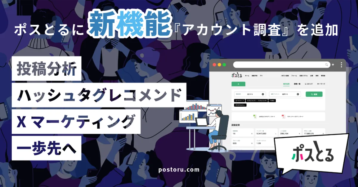 株式会社hashout(本社:東京都豊島区、代表取締役:落合 匠)は、彼らのSNS分析プラットフォーム『ポスとる』に新たに『アカウント調査』機能を追加しました。この機能により、特定のX(旧Twitter)アカウントの投稿を自動で分析し、可視化することが可能になります。