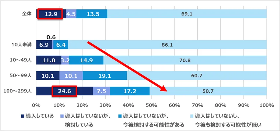 パーソルビジネスプロセスデザイン株式会社が実施した調査によると、日本全国の中小企業におけるBPO(ビジネスプロセスアウトソーシング)や業務代行の導入状況は意外にも限られたものでした。調査の対象は、従業員300人未満の企業の経営層や管理職550人です。結果として、BPOを導入している企業はわずか12.9%と、導入率の低さが浮き彫りになったのです。