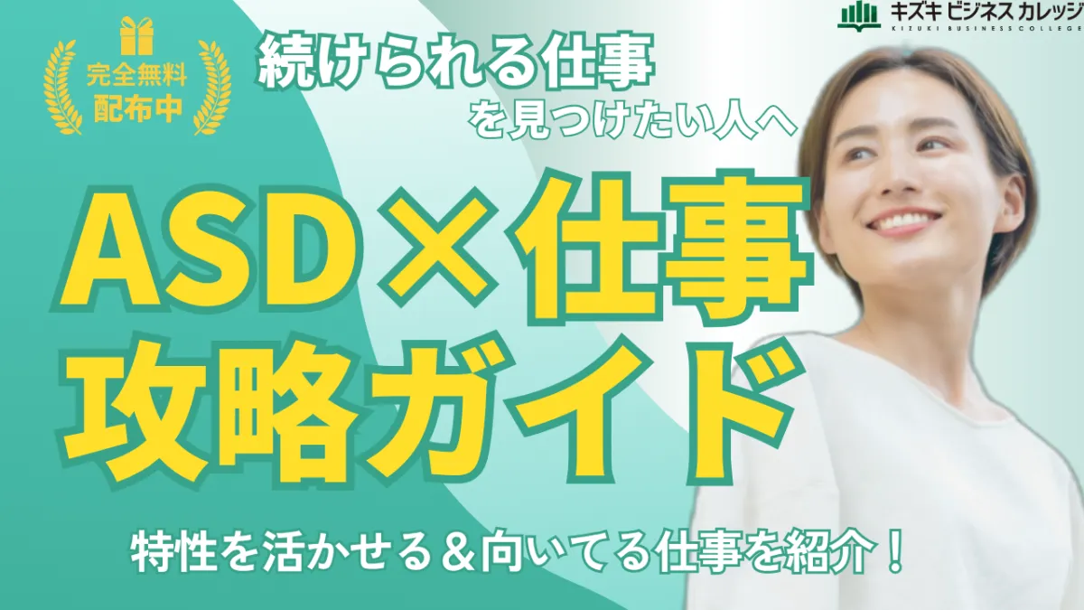 自分の特性を理解し、ASDのニーズに合った職場を見つけることは、働く上での成功や幸福を高める鍵です。キズキビジネスカレッジが提供するこのガイドブックは、ASDの特性を持つあなたが「向いてる仕事を見つける第一歩」となることを願っています。ぜひ、無料でダウンロードし、自分自身に合った働き方を見つける手助けとして活用してください。