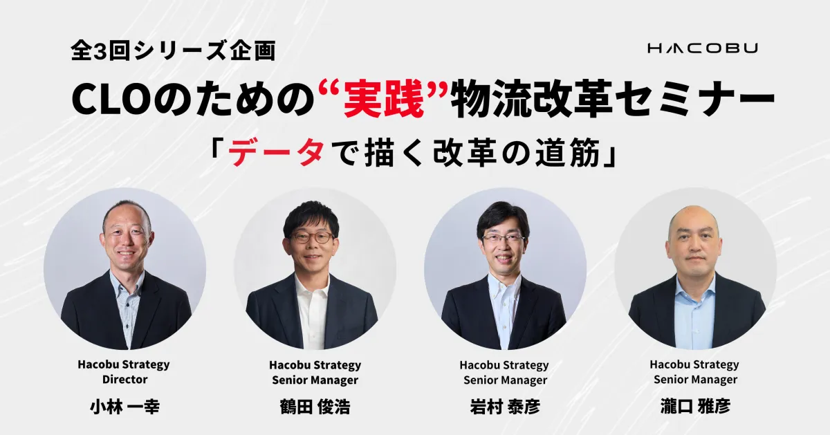 CLOには、現場の改善を推進するだけでなく、企業全体を通じて物流を改革する責任も求められています。物流をコストセンターから企業価値の源泉へと変革するには、経営戦略と現場の実行をつなぐ役割が求められます。このセミナーシリーズでは、Hacobu Strategyのコンサルタントが、実践的な改革事例を通じてCLOに必要な考え方や行動を学びます。