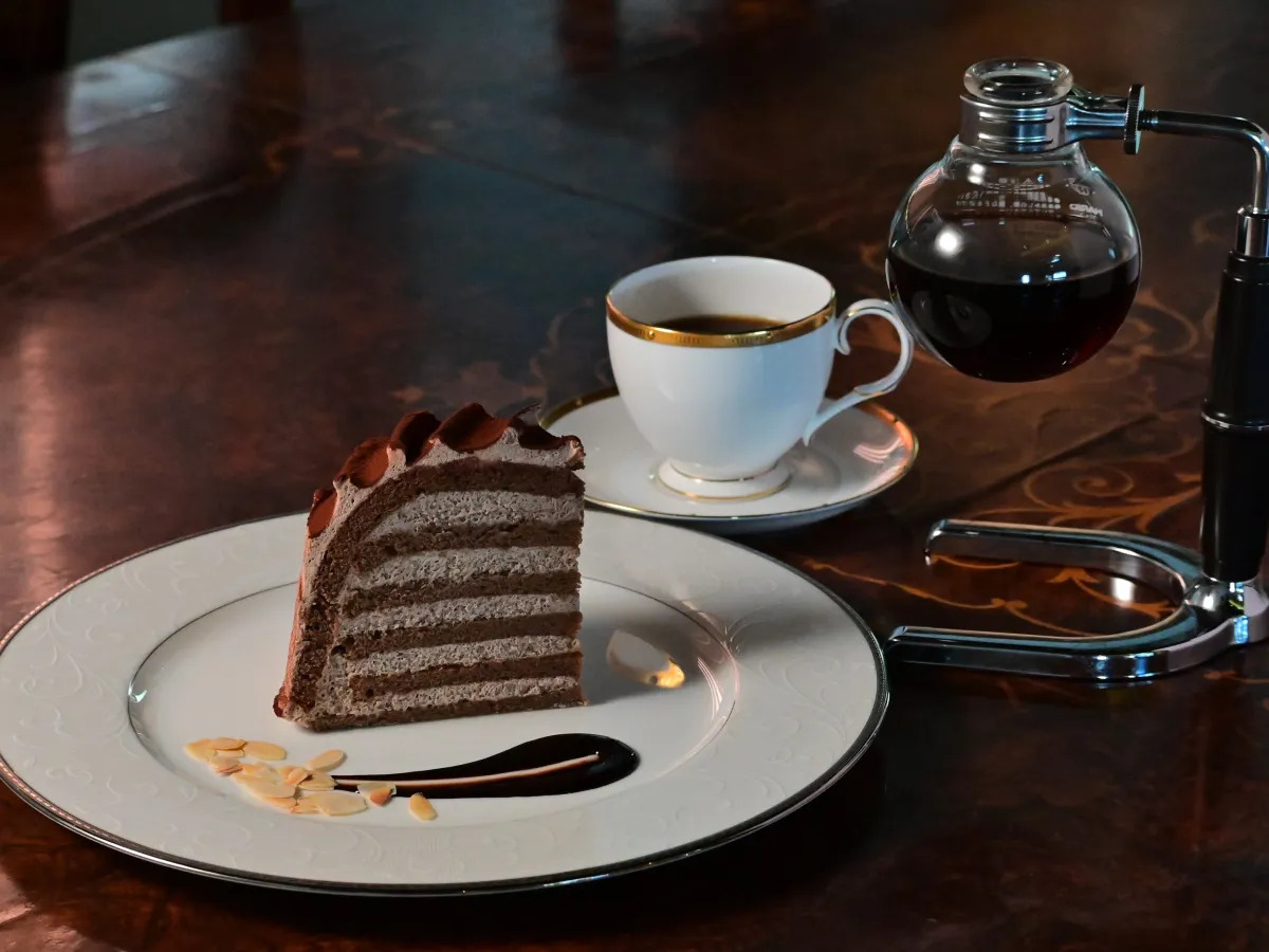 さらに、ケーキセットには、ドリンクがセットになっています。選べる飲み物は、世界中の一流ホテルでも人気の高い「ロンネフェルトティー」と、サイフォンでじっくりと淹れた「サイフォンコーヒー」が用意されています。このドリンクのペアリングは、ケーキの豊かな味わいを引き立て、特別なひとときを演出します。