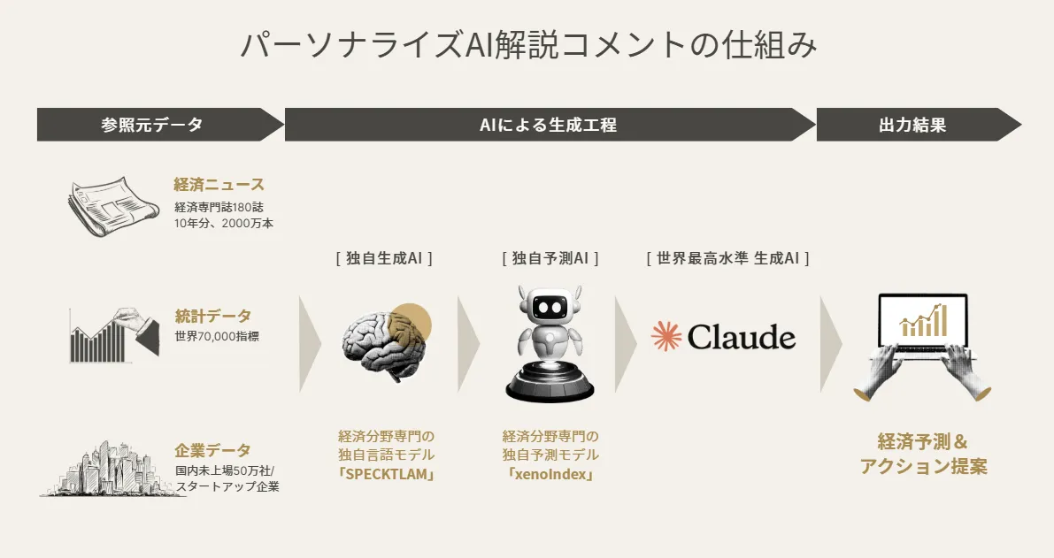 『xenoBrain』は、企業の業績や素材価格、業界需要といった幅広い経済情報を蓄積したプラットフォームです。独自のAIが、経済ニュースや企業の開示情報を解析し、高精度な予測を実現しています。これにより、事業会社や金融機関の経営意思決定を強力にサポートします。