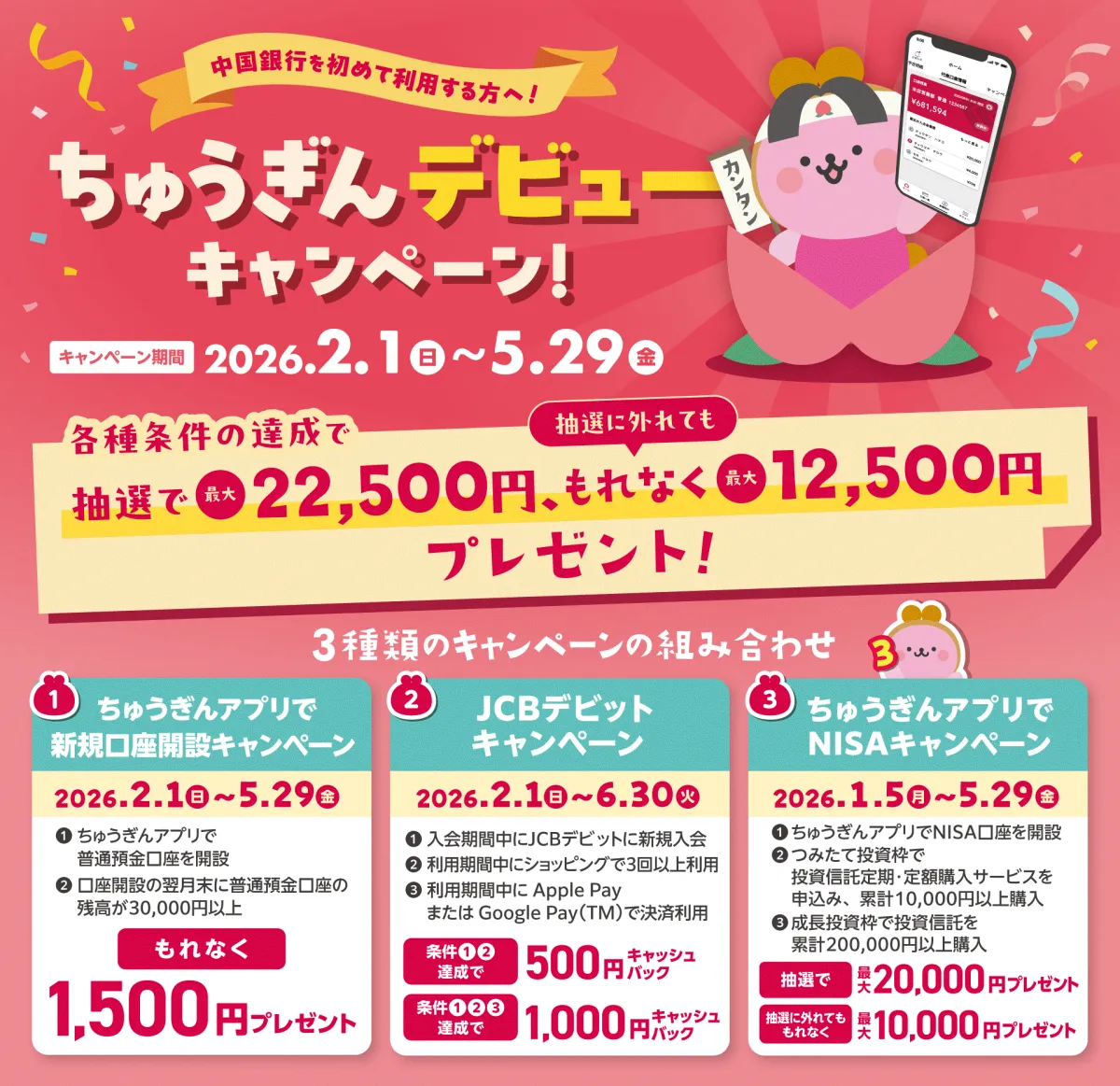 中国銀行は、2024年2月1日より新たに「ちゅうぎんデビューキャンペーン」を開催します。このキャンペーンでは、ちゅうぎんアプリを利用して普通預金の口座を開設し、各種条件を達成した顧客を対象に、抽選で最大22,500円がもらえるチャンスがあります。