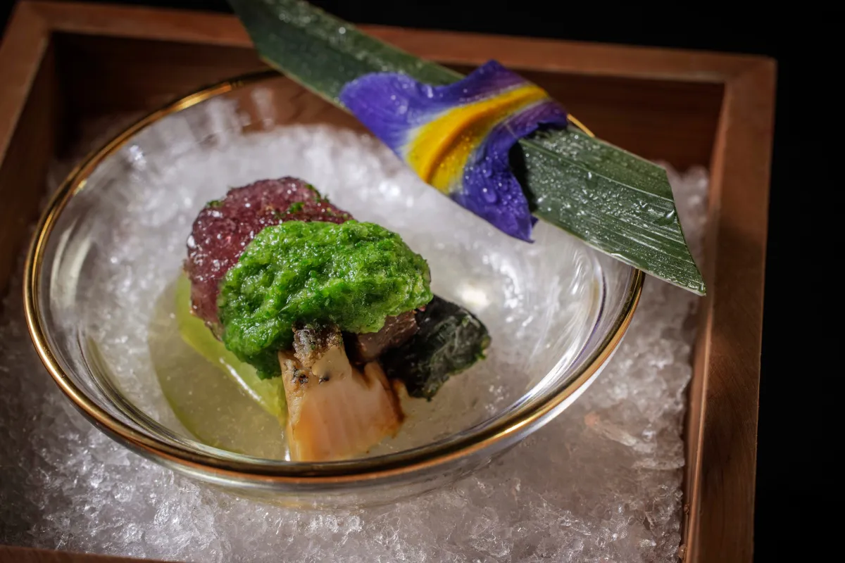 緑葵」は、紫陽花をモチーフにした料理で、ほのかな磯の香りが漂う酒蒸しの鮑と、シャキシャキとした食感の白ずいき、彩り豊かなオクラを組み合わせています。色鮮やかな金時草の紫色を取り入れた寒天が春の雨に濡れる紫陽花を表現し、素材本来の旨味を爽やかに引き立てています。