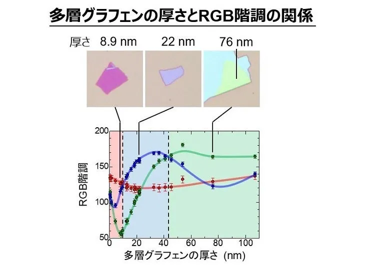 また、反射率についても簡潔な計算で求められることを示しており、これにより今後の光学素子の設計に役立つ基盤が整いつつあります。これらの成果は、多層グラフェンの応用研究やデバイス開発に大きな影響を与えると期待されています。さらに、今後は可視光域に留まらず、近赤外域まで波長を拡張し、多層グラフェンを光学素子に利用する可能性を広げることを目指しています。