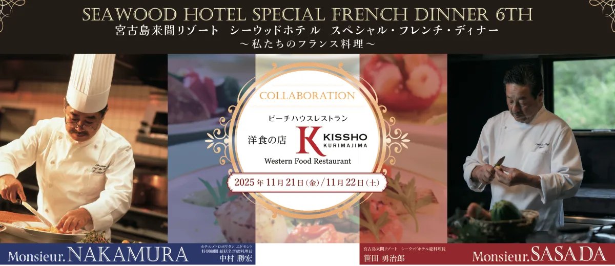 離島来間島に位置する「宮古島来間リゾートシーウッドホテル」は、2020年にオープンし、その独自の景観とリラックスした雰囲気で多くの旅行者を惹きつけています。この度、2025年11月21日(金)と22日(土)に、ホテルの総料理長である笹田勇治郎シェフと、東京の名レストラン「ホテルメトロポリタン エドモント」の特別顧問名誉総料理長、中村勝宏シェフとの素晴らしいコラボレーションによる「スペシャル・フレンチ・ディナー」を開催します。