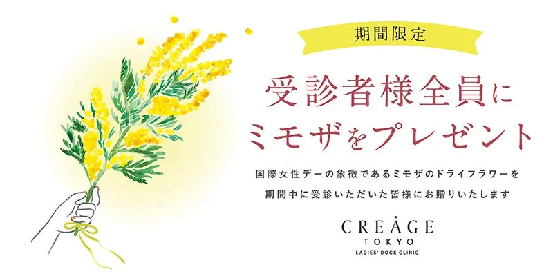 国際女性デーにちなんで、期間中に受診された方には、象徴的なミモザのドライフラワーが贈られます。このミモザは、イタリアの伝統に基づき、女性への感謝や敬意を表すものとされています。毎年この日は、女性の権利や社会での活躍を讃える日として広く認知されています。クレアージュ東京では、忙しい女性たちが自分の健康と向き合う重要なタイミングと捉え、受診者へミモザを通じて応援のメッセージを伝えます。