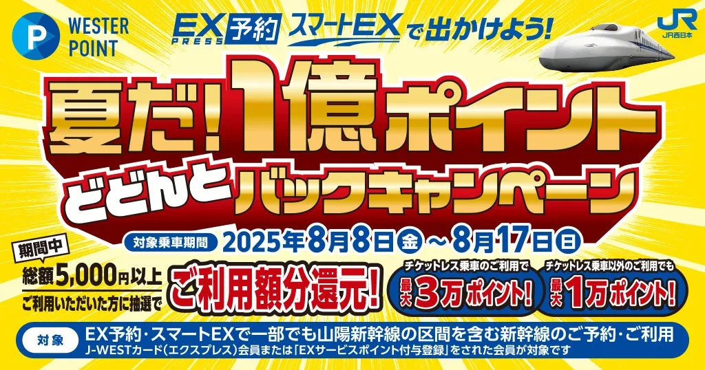 新幹線旅行を楽しむ皆様に朗報です!2025年8月8日から8月17日までの期間中、山陽新幹線を利用する際に「EXサービス」を利用すると、総額1億ポイントを還元するキャンペーンが開催されます。この機会を利用して、特別な夏の旅を計画しましょう!
