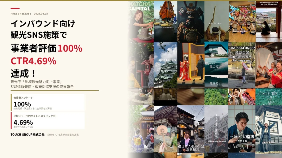 TOUCH GROUP株式会社が手掛ける観光業向けのSNS施策が、国内外で高い評価を得ています。観光庁が推進する2024年度補正「地域観光魅力向上事業」に基づき、全国の観光事業者を対象にしたInstagramを活用した取り組みが、特に注目を集めています。特に、欧米市場やアジア市場を視野に入れた情報発信と販売促進支援を行い、大きな成果を上げています。