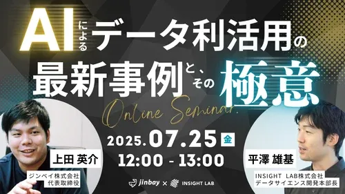 2025年7月25日に開催されるウェビナーでは、ジンベイ株式会社とINSIGHT LAB株式会社が共同で、AIを利用したデータ利活用の最前線を牽引する方法を紹介します。特に、ジンベイの提供する「ジンベイGenOCR」やINSIGHT LABの実践的な成功事例を通じて、データがビジネスに与える影響を深く掘り下げます。