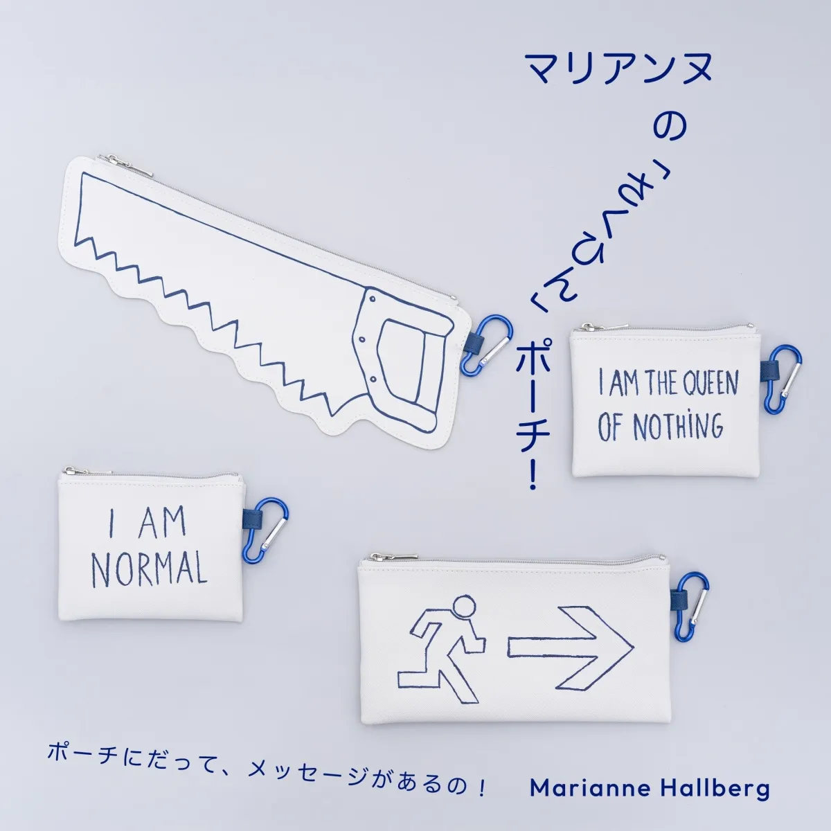 新作ポーチは、マリアンヌ・ハルバーグの個性的な作品のエッセンスをそのまま持つデザインで、全4種類がラインナップされています。陶芸家的な視点で表現されたメッセージは、どれも一癖も二癖もあり、持ち歩くことで日常に笑顔をもたらしてくれるアイテムばかりです。