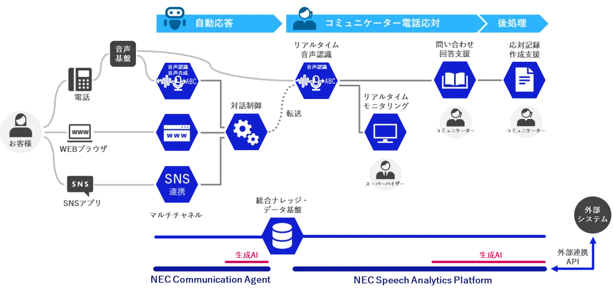 この新しいシステムは、すでに多くの企業で導入されているNEC製のチャットボットと、電話の自動応答機能を組み合わせ、応答精度を高めることを目指しています。また、NEC Speech Analysis Platformと連携することで、顧客との対話履歴をスムーズに確認できるようになり、各種課題に対する解決力が向上します。