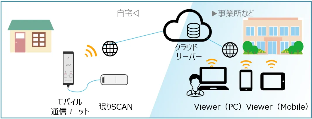 新たなサービスでは、SIMカードを内蔵した「モバイルデータ通信ユニット」を使用することで、家庭でも簡単に「眠りCONNECT」を導入することができます。このユニットを「眠りSCAN」と接続するだけで、インターネットに接続され、データはクラウドサーバーへ集約されます。ユーザーは専用アプリ「Viewer」を通じて、外出先からでも健康データを確認したり設定を変更することができ、非常に便利です。