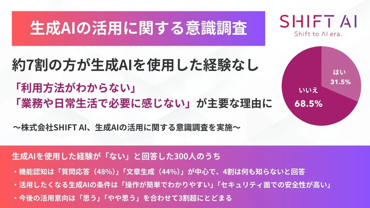 最近、企業や個人が注目する生成AI。しかし、意外にも日本では多くの人がこの技術を利用したことがないという現状があります。株式会社SHIFT AIが実施した意識調査によると、全国の男女3000人を対象にした結果、約7割の人が生成AIを未経験であることが分かりました。