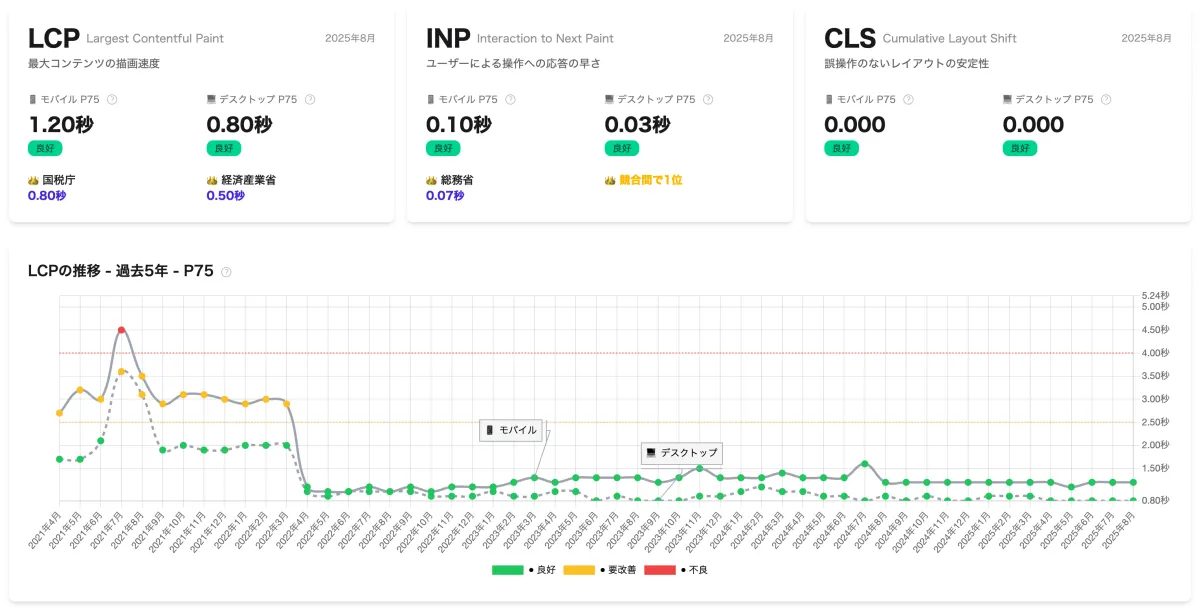 例えば、デジタル庁のWebサイトの場合、2022年4月にLCPの値がモバイルで2.90秒から1.10秒、デスクトップで2.00秒から1.00秒に改善されました。このように、サイトリニューアル前後の速度改善を定量的に確認できる点は、関係者間の意思疎通にも大きく寄与します。