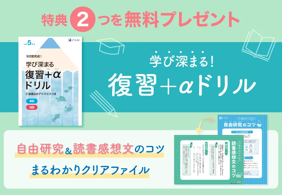 株式会社Z会は、子どもたちの学習をサポートするため、小学生向けの通信教育において期間限定の資料請求キャンペーンを展開しています。このキャンペーンでは、資料を請求した方に、学習に役立つ特典がプレゼントされます。特に、夏の学習に最適な『復習+αドリル』と「自由研究・読書感想文のコツまるわかりクリアファイル」が登場します。