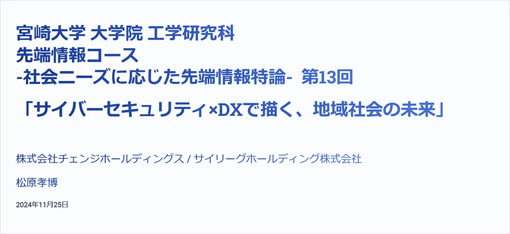 最近、デジタル社会の進展に伴って、サイバーセキュリティの重要性が高まっています。その中で、宮崎県では宮崎大学、宮崎県警、宮崎県サイバーセキュリティ協議会、そしてサイリーグホールディングスの4者が協力し、大学院工学研究科にて「サイバーセキュリティ×DXで描く、地域社会の未来」をテーマにした共同講義を実施しました。この講義は、地域におけるサイバーセキュリティ人材の育成を目的としており、特にDX(デジタルトランスフォーメーション)人材育成に力を入れています。