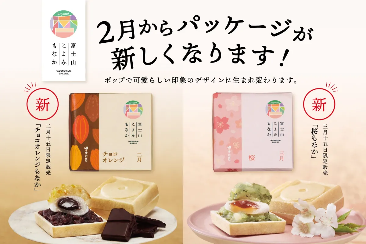 株式会社田子の月が、昨年10月から新CMと共に展開している「富士山こよみもなか」が、今月15日から新デザインのパッケージで販売開始されることが決まりました。このお菓子は、毎月15日限定で旬の素材を使った12種類の味わいを楽しめる特別な商品です。