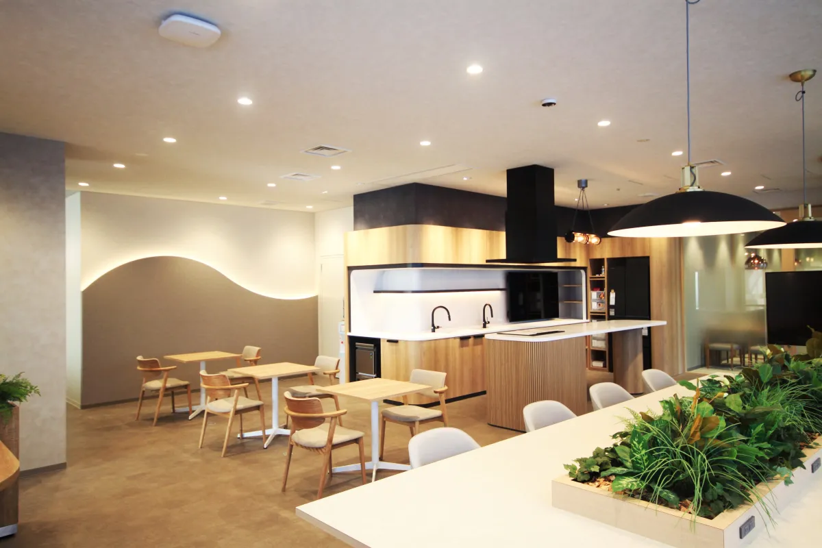 リニューアルによって1階には新たに多目的に使用できるラウンジスペースが登場しました。これまでのモデルルームを改装し、今では半個室ブース、カウンター席、リラックスできるソファスペース、さらにコーヒーやキッチンの設備を完備しています。この環境では、仕事の合間に気分転換を図ることができ、軽い打ち合わせや社内交流の場としても最適です。