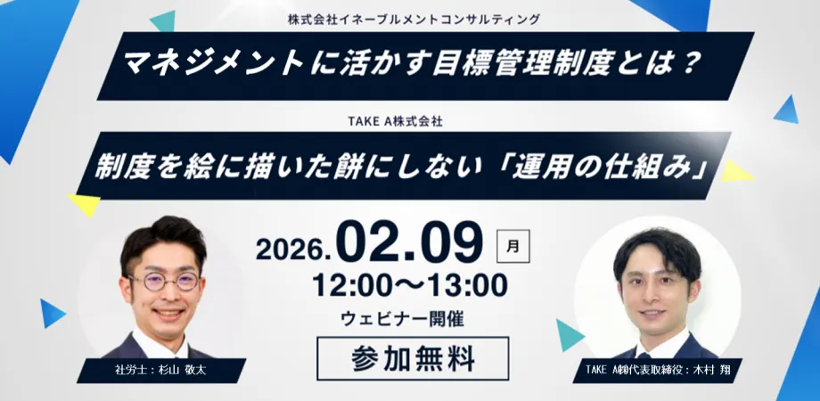 2026年2月9日(月)に、TAKE A株式会社と株式会社イネーブルメント・コンサルティングがコラボレーションし、オンラインウェビナー「マネジメントに活かす目標管理制度とは?」と「制度を絵に描いた餅にしない『運用の仕組み』」を開催します。業務効率化の一環として、目標管理制度の効果的な活用法についての深い洞察を提供するこのイベントに、ぜひご参加ください。