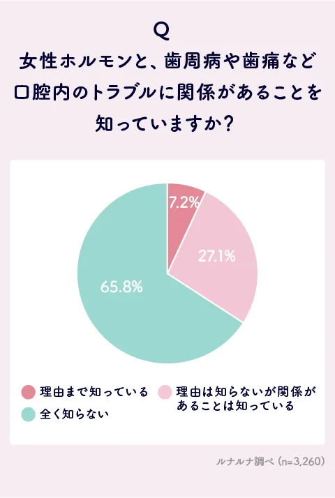 調査結果によると、女性ホルモンと口腔内トラブルに関する知識がある人はわずか約29%にとどまりました。具体的には、「理由まで知っている」と答えた人が7.2%、「理由は知らないが関係があることは知っている」が27.1%、そして「全く知らない」が65.8%という結果でした。このことから、多くの女性が、その重要な関係性を認識していないことがわかります。