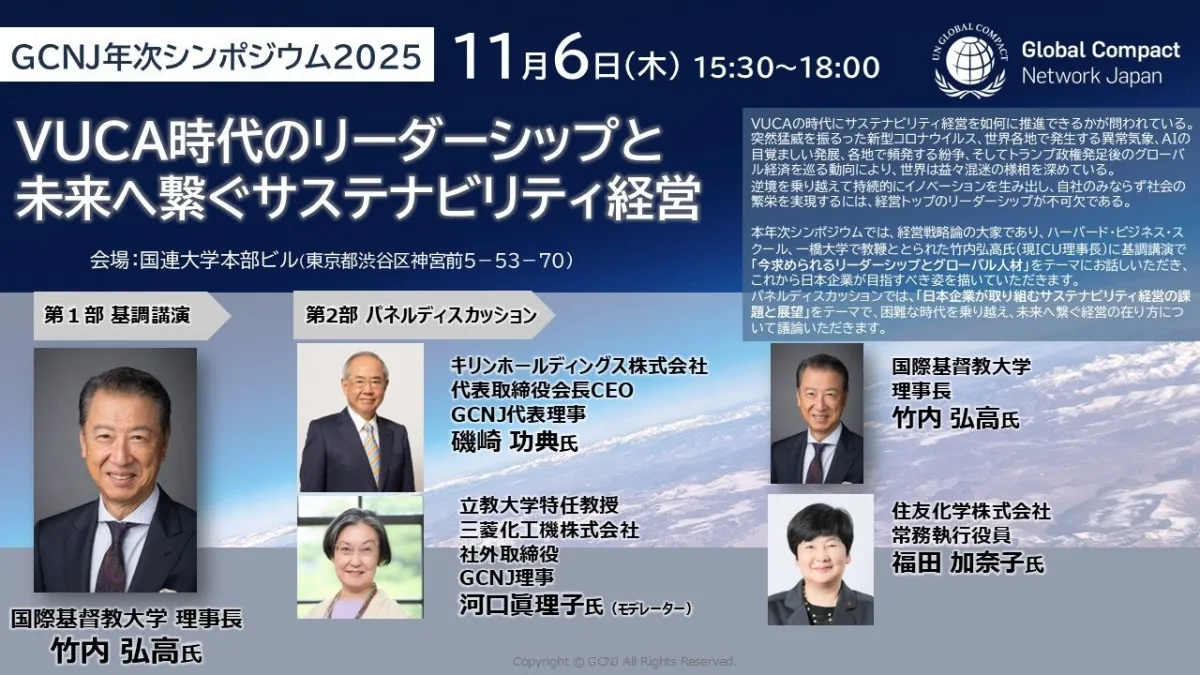 本シンポジウムのテーマは『VUCA時代のリーダーシップと未来へ繋ぐサステナビリティ経営』であり、現代の厳しい経済環境における企業の在り方を考察します。国際基督教大学の理事長である竹内弘高氏とGCNJの新代表理事・磯崎功典氏(キリンホールディングス株式会社代表取締役会長CEO)を迎え、貴重な講演やディスカッションが行われます。