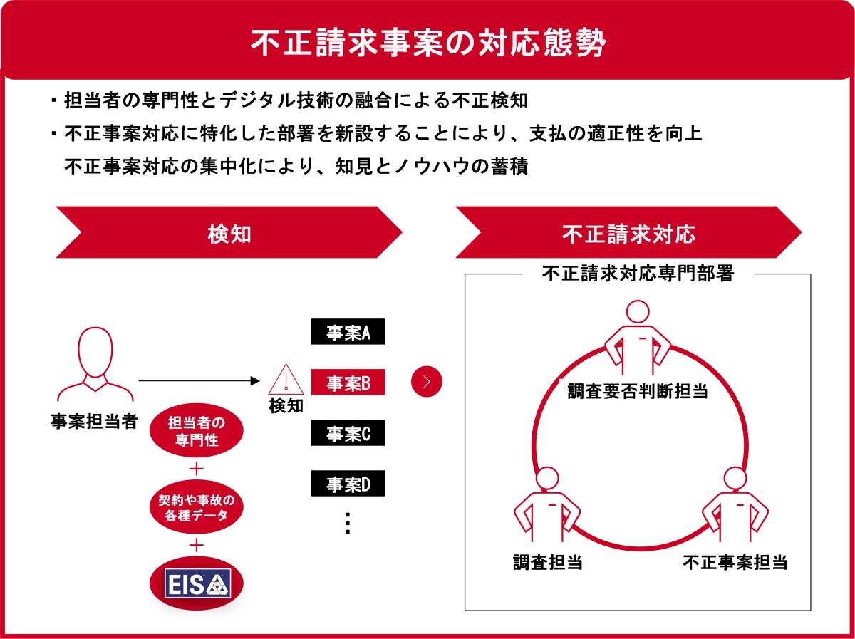 不正請求事案に迅速かつ効果的に対応するため、損保ジャパンは専門部署を2025年4月に新設します。この部署は、不正請求の前兆を検知した案件に対して、専門的に調査と対応を行う役割を担います。この取り組みにより、全国のサービス拠点における不正請求手口の傾向把握が進むと期待されています。