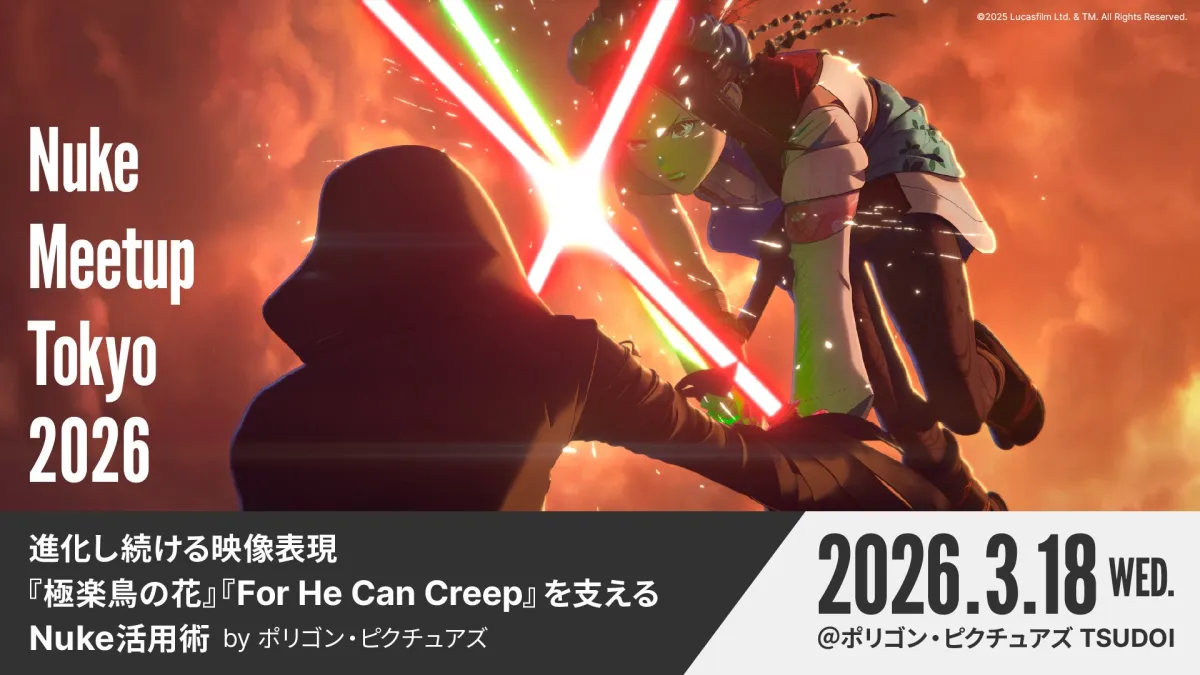2026年3月18日(水)、東京都港区にあるポリゴン・ピクチュアズのオフィスにて、「Nuke Meetup Tokyo 2026」が開催されます。このオフラインセミナーでは、アニメーション制作におけるコンポジットソフトウェア「Nuke」の活用事例や最新情報が紹介されます。特に、ポリゴン・ピクチュアズが手掛けた話題作『スター・ウォーズ:ビジョンズ Vol.3 極楽鳥の花』や『ラブ、デス&ロボット Vol.4 彼は忍び寄る』に焦点を当て、映像表現の新たな扉を開く技術が紹介される予定です。