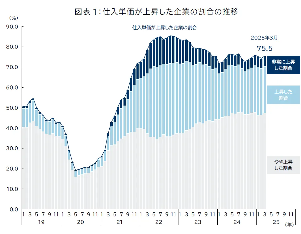 株式会社帝国データバンクは、全国26,674社を対象に「TDB景気動向調査」を実施し、有効回答企業は1万716社(回答率は40.2%)です。2025年3月の調査結果によると、約75.5%の企業が仕入単価の上昇を認識しており、このトレンドは40ヵ月連続で続いています。これにより、企業の事業環境は非常に厳しいものとなっていることが分かります。