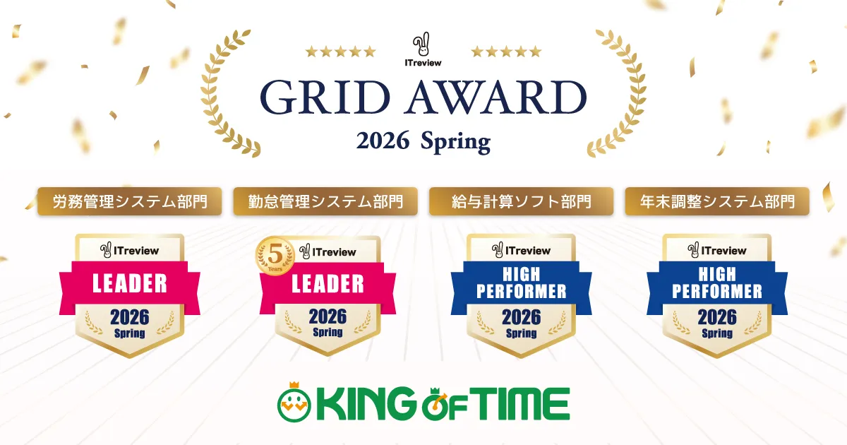 株式会社ヒューマンテクノロジーズが提供するクラウド勤怠管理・人事給与システム「KING OF TIME」が、アイティクラウド株式会社主催の『ITreview Grid Award 2026 Spring』で最高位の「Leader」を28期連続で受賞したことが発表されました。この受賞は、同サービスの利用者からの高い評価と満足度が反映された結果です。