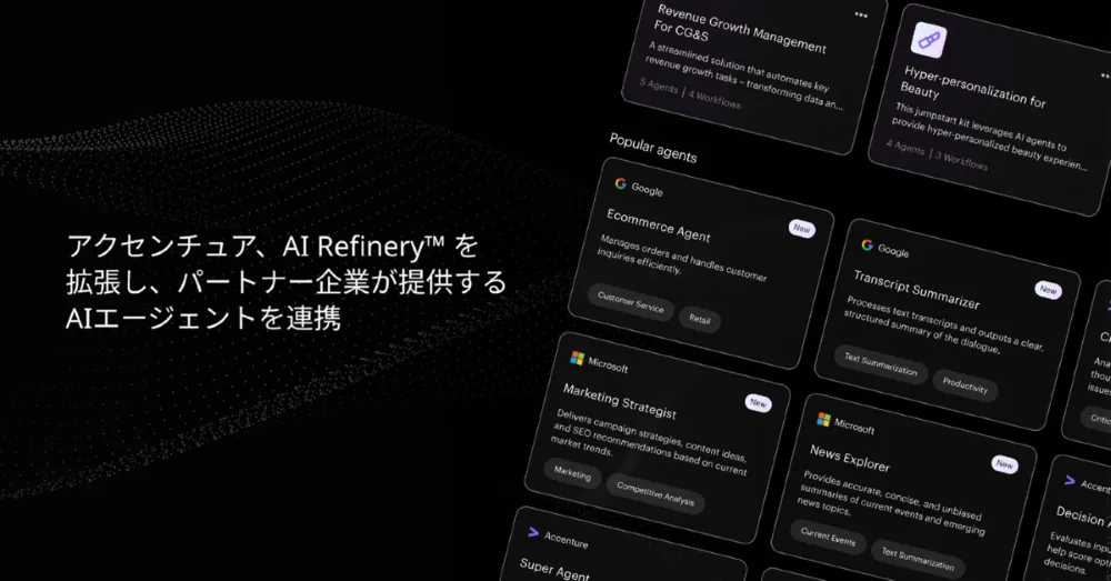 アクセンチュアのAIセンター長、保科 学世は、「AIエージェントの急速な成長により、企業はますます多くのエージェントを開発する必要に迫られています。これに伴い、最適な技術の選択と迅速な構築が求められています。この新しいサービスは、企業にとってAIエージェント能力の最大化を助け、全体の業務変革を推進するものです」と語っています。