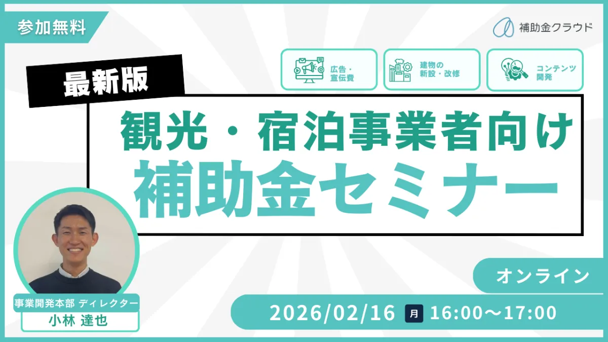 2026年2月16日(月)の16:00〜17:00に、観光事業者や宿泊業者を対象とした最新の補助金セミナーが開催されます。今回のセミナーはオンラインで実施され、参加申し込みは専用ページから行うことができます。