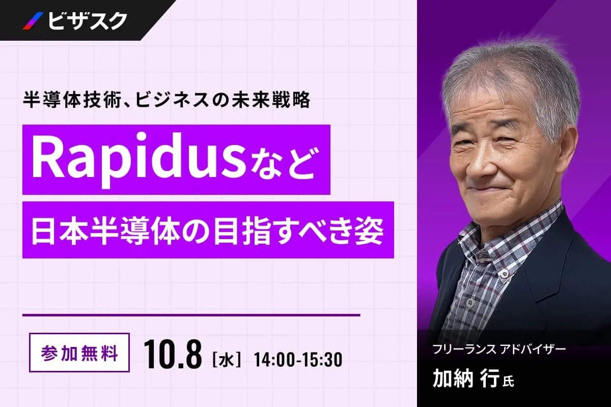 株式会社ビザスクが主催する『Rapidusなど日本半導体の目指すべき姿』というテーマの無料オンラインセミナーが、2023年10月8日(水)14:00より行われます。フリーランスアドバイザーの加納行氏が登壇し、日本の半導体産業の現状と未来について深い見解を披露します。
