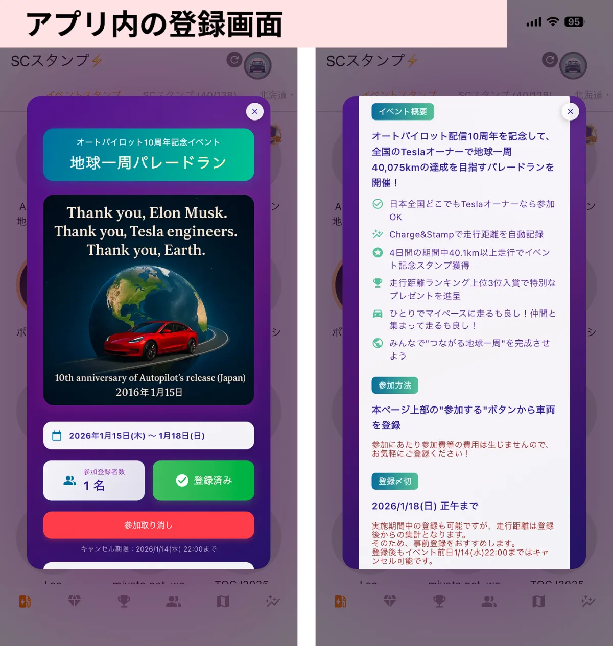 このイベントは、テスラオーナーであればどなたでも参加可能で、専用アプリ「Charge&Stamp」を使って走行距離を計測し、全国のオーナーとつながりを感じながら進行するユニークな体験です。