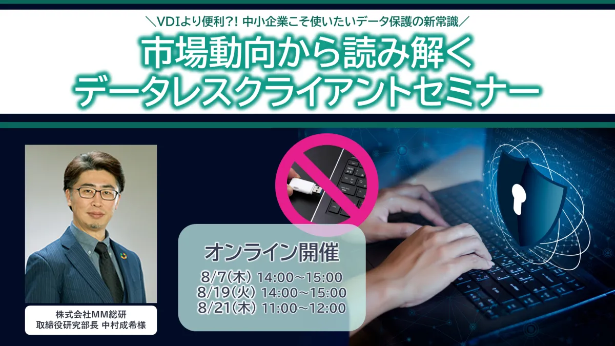 そうしたデータレスクライアントについて詳しく学ぶ場として、2025年8月にNECが主催するWebセミナーが開催されます。このセミナーでは、株式会社MM総研の取締役研究部長である中村成希氏が、国内市場におけるデータレスクライアントの最新の市場動向を詳しく解説します。