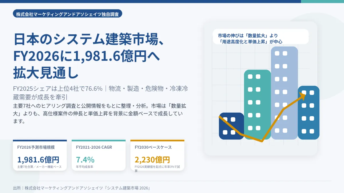 株式会社マーケティングアンドアソシェイツが4月13日に発表した『システム建築市場 2026 ~日本のシステム建築市場の現状分析と見通し~』は、日本におけるシステム建築市場の状況を深く掘り下げた貴重なレポートです。